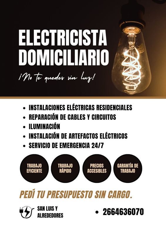 Facundo Pieroni ofrece servicios de electricidad domiciliaria en San Luis Capital, brindando soluciones rápidas y seguras ante cualquier problema eléctrico. Especialista en diagnóstico y reparación de fallas, realiza instalación de luminarias y ventiladores, cambio de enchufes, llaves, térmicas y disyuntores, además de detección precisa de problemas eléctricos con instrumentos de medición. Su trabajo se destaca por la responsabilidad, prolijidad y atención personalizada, ideal para hogares que necesitan un electricista confiable. ⚡ Consulta sin cargo por WhatsApp