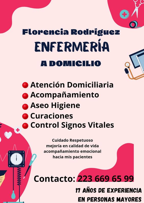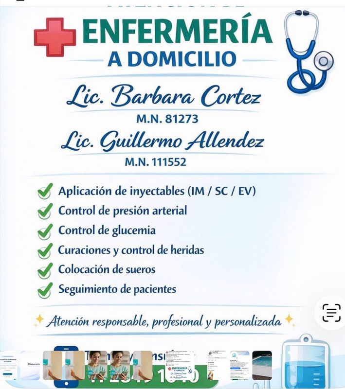 🩺 Enfermería a Domicilio – Lic. Jésica González Licenciada en Enfermería con experiencia en cuidados domiciliarios, brindando atención profesional, humana y responsable a pacientes pediátricos, adultos y adultos mayores. Ofrece servicios de enfermería a domicilio, adaptados a las necesidades de cada paciente, priorizando el bienestar, la higiene y el confort. ✅ Servicios que ofrece: 💉 Inyectables EV / IM / S/C 🩸 Recanalización 🚰 Colocación de sonda vesical 🥛 Colocación de sonda nasogástrica 🩹 Curación plana y curaciones múltiples 🧺 Cambio de bolsa de colostomía 🛏 Higiene y confort (con y sin movilidad reducida) 🚽 Enema evacuante 👶 Recambio de cánula (pediátrico) 🍼 Recambio de botón gástrico (pediátrico) 📍 Zonas de atención: Berazategui Quilmes Ezpeleta 🕒 Disponibilidad: A coordinar – consultas sin compromiso