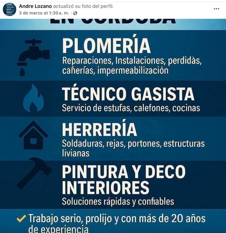 Matías – Plomería en Córdoba 🔧 Plomero Matías ofrece servicios de reparación y mantenimiento de plomería para el hogar. Trabaja con responsabilidad y rapidez, resolviendo problemas comunes como pérdidas de agua, arreglos de cañerías y mantenimiento general de instalaciones sanitarias. Se destaca por brindar atención personalizada y soluciones eficientes, ideal para quienes buscan un servicio confiable en el hogar. Zona: Córdoba Capital