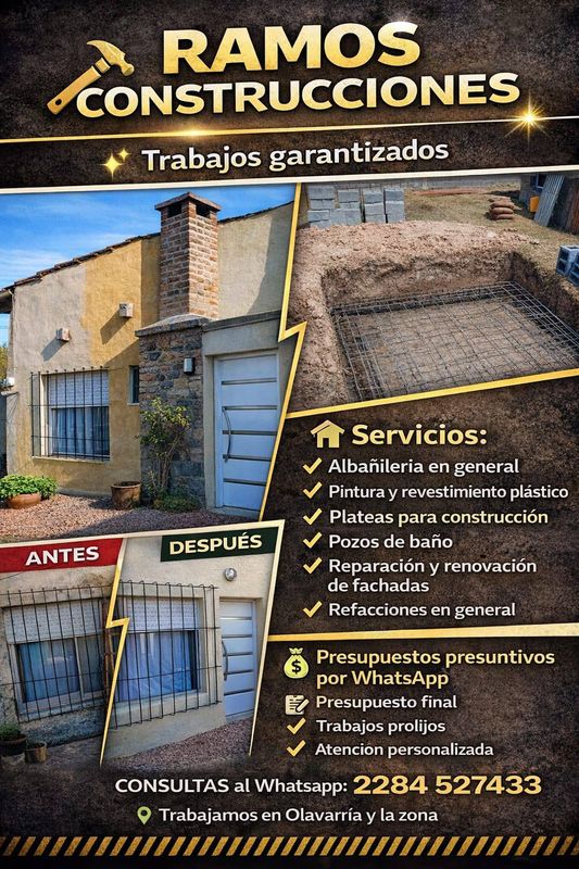 🧱 Miguel – Albañil, Colocador, Pintor y Plomero (Buenos Aires) Hola, soy Miguel, me dedico a la albañilería, colocación de cerámicos, pintura y plomería. Trabajo con responsabilidad, puntualidad y compromiso, cuidando cada detalle para que el resultado sea de calidad. Atiendo en todas las zonas de Buenos Aires, ofreciendo soluciones completas para hogares y comercios.
